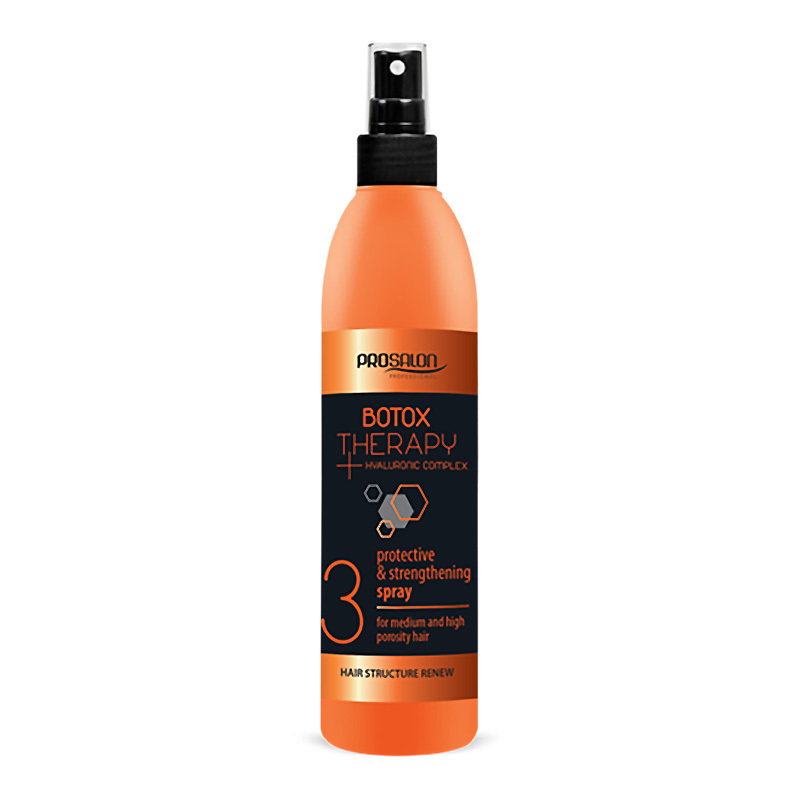 Антиэйджинговый спрей для волос Prosalon - нежный двухфазовый спрей для использования на влажные или сухие волосы. Не смываемый. Легкая формула на утяжеляет волосы. Обогащенный гиалуроновой кислотой, которая эффективно увлажняет пересушенные и распушенные волосы, а так же препятствует потере влаги в течение дня. Фильтр УФ защищает волосы от вредного воздействия внешних факторов окружающей среды, потускнения и выгорания цвета.