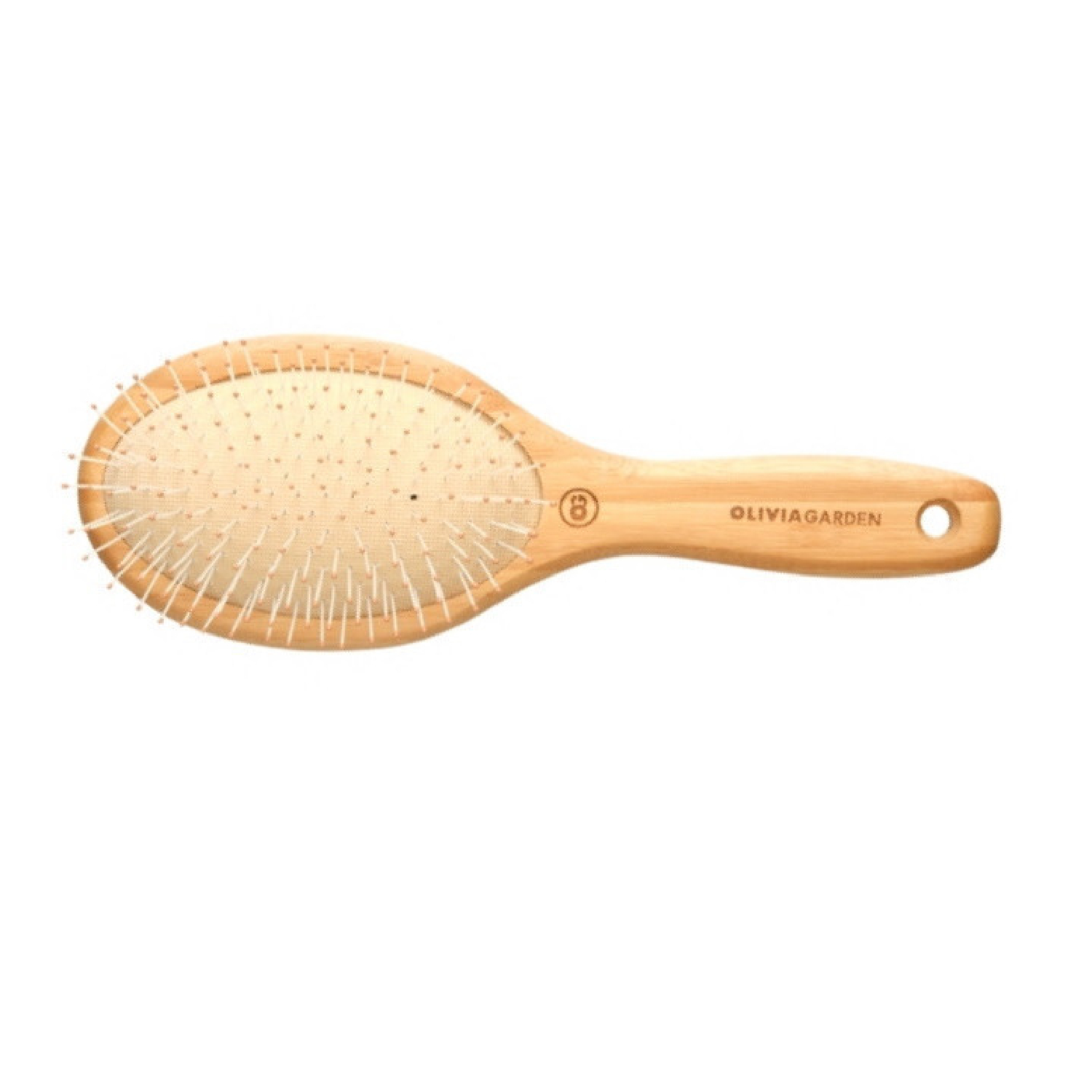 Массажная щётка Babmboo Touch Olivia Garden M – средняя массажная щётка, сделана из бамбука. Штифты с шариками на концах изготовлены из специального термостойкого нейлона и "заряжены" отрицательными ионами. Это обеспечивает мягкое и бережное расчёсывание и оказывает положительное действие на волосы: они становятся более мягкими и блестящими. Кроме того щётка снимает статику и оказывает антибактериальное действие.