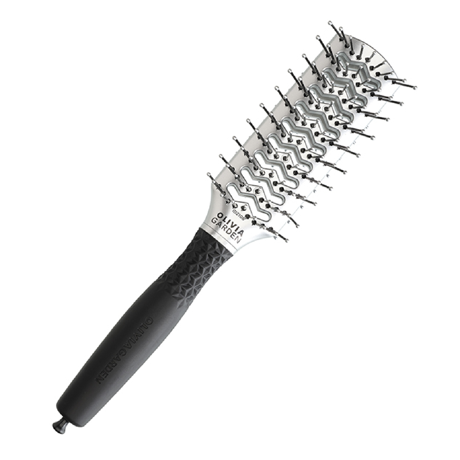 Двухсторонняя туннельная щётка Essential Style Double Silver с пластиковым основанием и штифтами с шариками из термостойкого нейлона. Удобная прорезиненная ручка оснащена специальным хвостиком для разделения и выделения прядей. Щетка идеально захватывает волосы и приподнимает их у корней, используется для быстрой укладки волос феном, придаёт нужное направление волосам. Волосы имеют свойство накапливать электростатические заряды. Это обусловлено трением, поэтому пряди часто электризуются при расчесывании. Щетки для волос Olivia Garden с антистатической щетиной помогут этого избежать. В результате локоны приобретут блеск, мягкость и шелковистость.