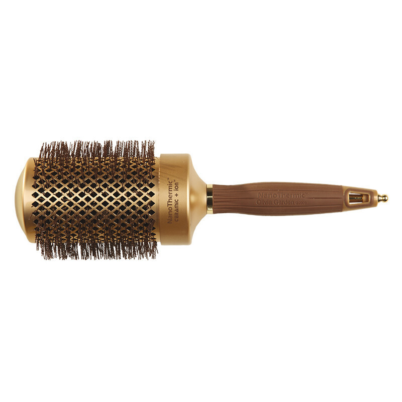 Термобрашинг Olivia Garden Nano Thermic с щетиной из специального термостойкого нейлона имеет волнистую форму и закруглённые кончики. В совокупности с керамико-турмалиновой рабочей поверхностью брашинга это обеспечивает мягкую и бережную укладку волос. Эргономичная ручка оснащена секционным выдвижным наконечником. С его помощью легко выделить отдельные пряди и сделать идеальный пробор.