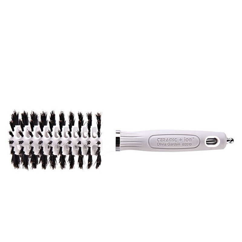 Термобрашинг Olivia Garden Nano Thermic Vent Combo оснащён комбинированной щетиной, которая закреплена в специальных держателях из термостойкого материала, установленных на большом расстоянии друг от друга. Такая система крепления обеспечивает сквозную вентиляцию на 50% лучше по сравнению с классическими аналогами. Процесс сушки и укладки волос уменьшается вдвое! Удобная эргономичная прорезиненная ручка оснащена специальным хвостиком для разделения и выделения прядей. Благодаря применению современных высокотехнологичных материалов, брашинг очень лёгкий и удобный.
