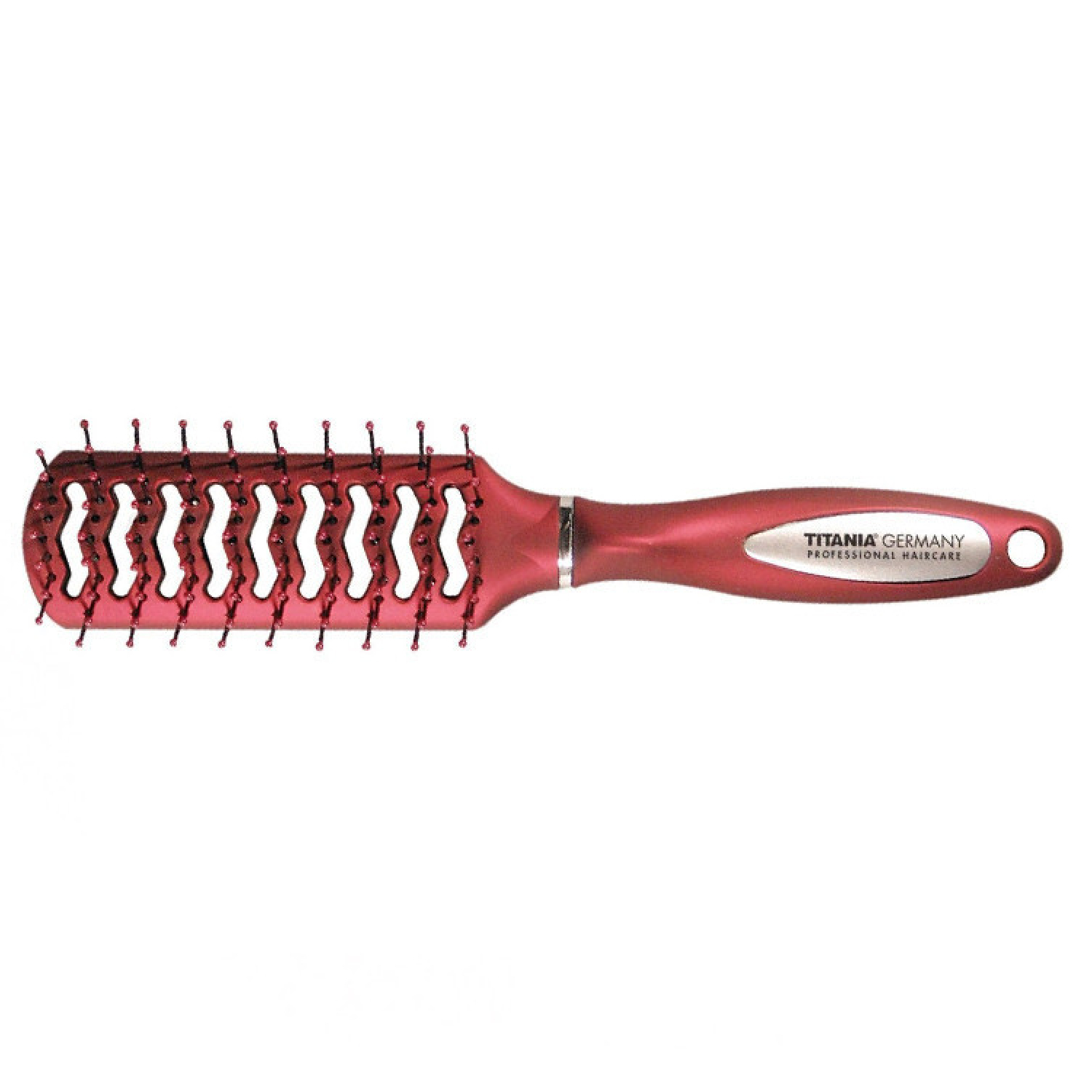 Туннельная щётка Titania 1634 девятирядная на пластиковой основе с нейлоновыми штифтами и округлыми наконечниками. Велюровое покрытие ручки предотвращает скольжение руки во время укладки.