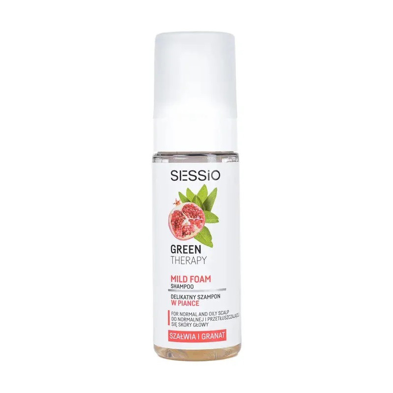Шампунь-пенка c шалфеем и гранатом для нормальной и жирной кожи Sessio Green Therapy cодержит 94% ингредиентов натурального происхождения. Регулирует секрецию кожного сала и устраняет его избыток, придавая ощущение свежести. Благодаря наличию шалфея, богатого витамином B, он укрепляет и питает волосы и кожу головы, помогает избавляться от перхоти. Экстракт плодов граната имеет антивозрастной и фотозащитный эффект.