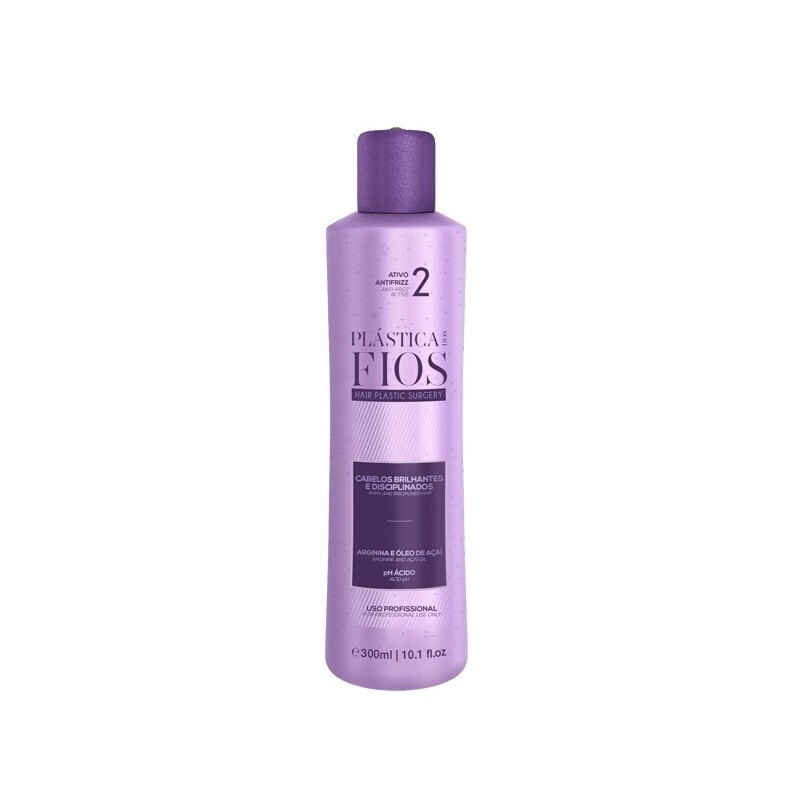 Профессиональный состав Plastica dos Fios Anti-Frizz Active Cadiveu №2 для проведения процедуры выпрямления «Пластическая хирургия для волос» максимально подойдёт для работы с волосами европейского типа. Уникальная формула адаптирована для работы с волосами, имеющими тонкую структуру, также подойдёт для обесцвеченных волос. Процедура заключается в уплотнении и разглаживании волос с помощью инновационного состава, в который входят незаменимые аминокислоты, в том числе аргинин, масло семени ягоды асаи и гидролизированный кератин.