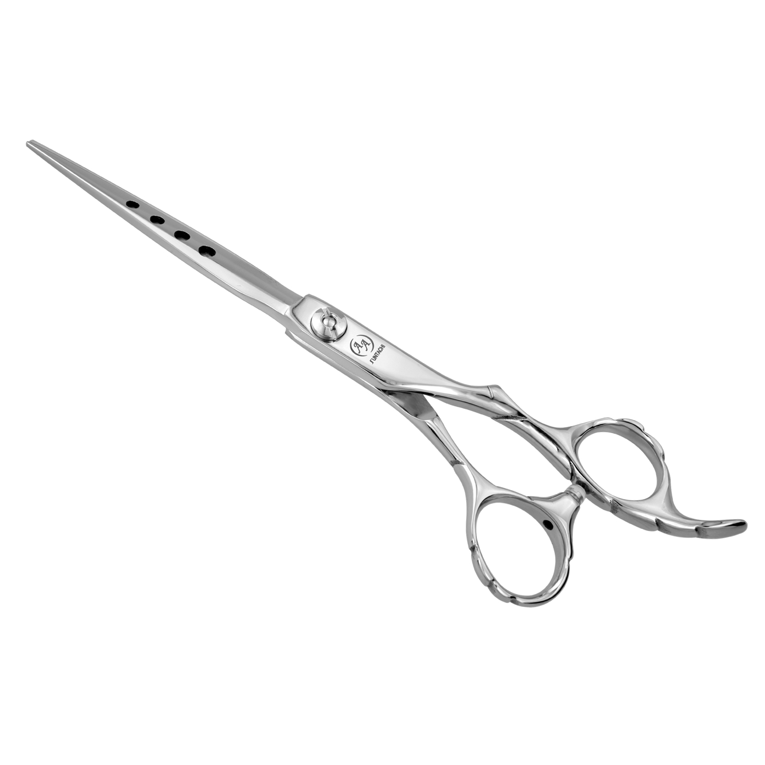 Ручка: Модель имеет эксклюзивную ручку с уникальной эргономикой и кольцами в двух различных плоскостях. Кольца ручек имеют анатомическую форму и изгиб для комфортного размещения в руке мастера. Ножницы с этой ручкой идеально ложатся в руку и являются настоящим продолжением кисти мастера, ножницы можно ставить под любым углом и производить срезы, кисть руки и предплечье при этом не напрягаются.