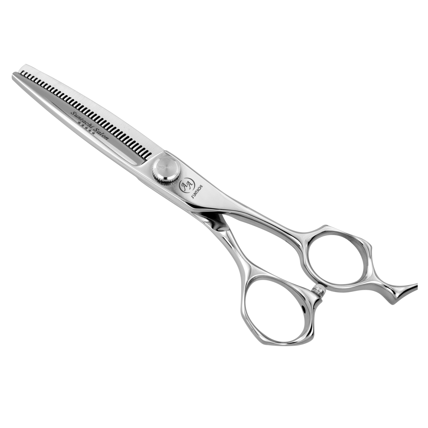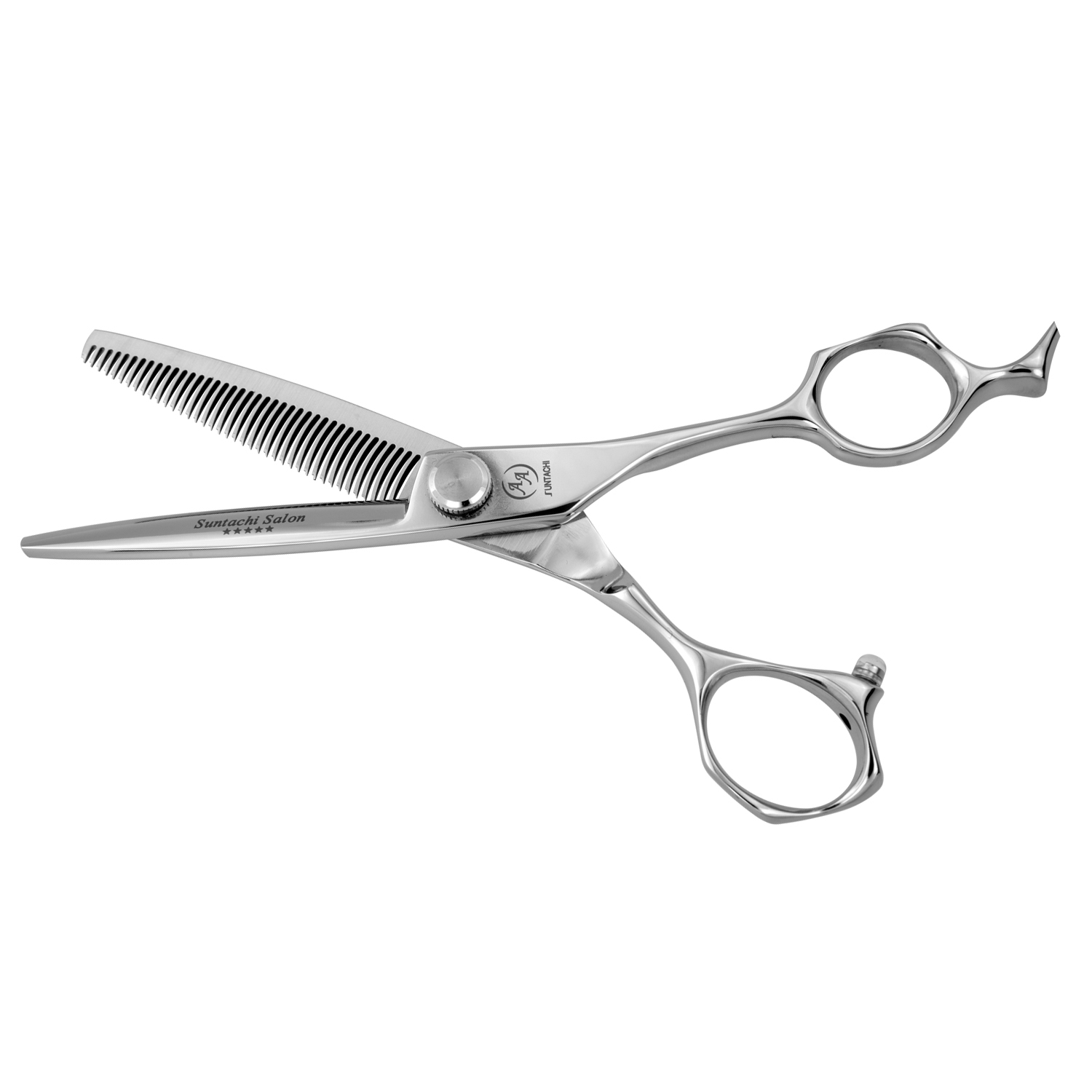 Виды срезов и техника: Филировочные ножницы Suntachi Salon E01-6040R в размере 6 дюймов с верхним расположением филировочного полотна снимают 25%. Саблевидный вид сплошного лезвия в комбинации с 40-ка с-образными и направленными зубцами, оснащенными одним микрозубчиком на каждом зубце, позволяют мягко снять объём без возможных ошибок, не создавая контрастного перехода с проработанной зоны в нетронутую. Тем самым после проработки возникает эффект гармоничного и естественного вида завершенной стрижки, волосы правильно ложатся, стрижка долго сохраняет форму. Модель идеально подходит под классические техники тушевки и филировки.