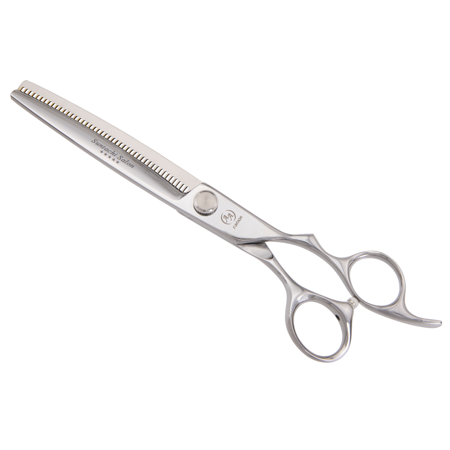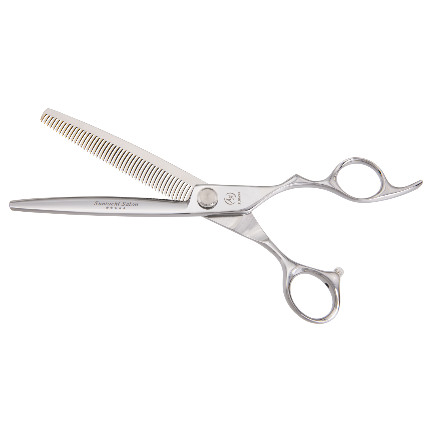 Ручка: Модель имеет эксклюзивную и удобную ручку с уникальной эргономикой и ярко выраженным разделителем для пальцев на верхней части ручки. Кольцо на верхней ручке имеет увеличенный размер и вытянутую форму, а так же литой усилитель для мизинца. Нижнее кольцо имеет увеличенный размер и повернуто к большому пальцу что обеспечивает более удобное размещение. Кольца модели достаточно массивны и имеют хорошую инерционность при смыкании, при этом производимый срез практически не ощущается. С этой ручкой ножницы можно ставить под любым углом и при этом комфортно производить захват ручек, что неоценимо при сложных срезах.